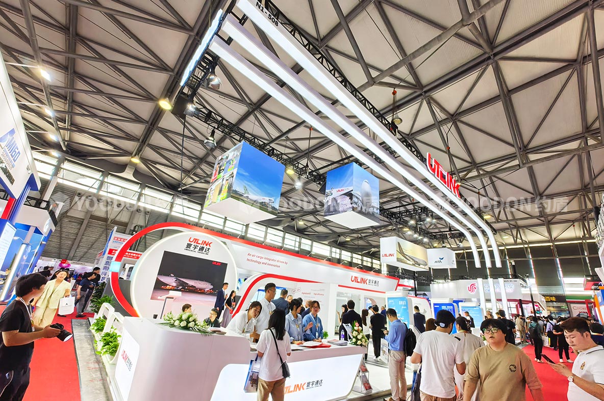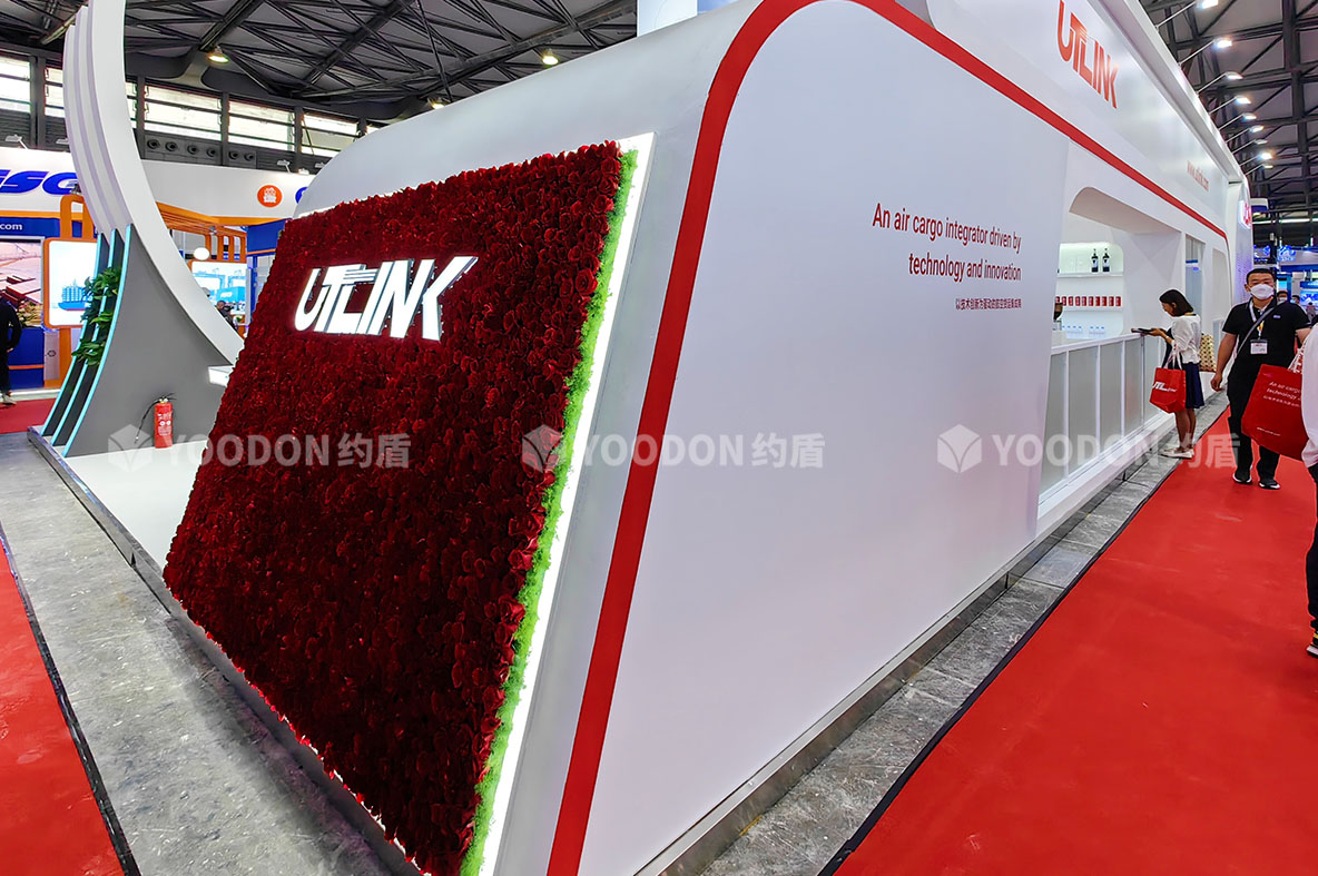展位從不同角度都通透明亮,非常吸睛,多處LED大屏幕、柔性燈帶冰屏使用,讓展臺動感起來,玫瑰花展臺的設計更是新穎之處,擴大視覺的同時大氣渲染了寰宇通達的國際品牌形象,聚擾眼球,給參展觀眾帶來不一樣的視覺盛宴。